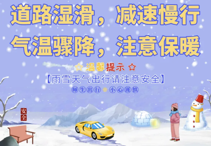 随着冬季的来临,雨雪天气逐渐增多,请大家特别注意防寒保暖和出行安全。记得增添衣物,戴上帽子和手套,穿上防滑的鞋子,以抵御寒冷和湿滑的路面。出行时,尽量避开结冰和积雪的路段,驾驶时减速慢行,保持安全车距,确保视线清晰。无论是步行还是驾车,都要保持警觉,避免滑倒或发生交通事故。安全第一,健康至上,愿每个人都能平安度过寒冷的冬季。