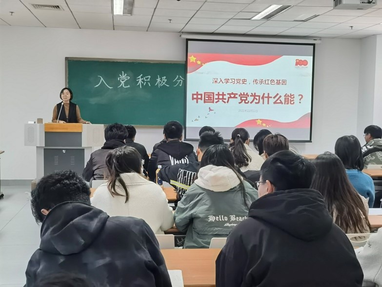 2.一次党史学习教育专题党课。11月11日,直属党支部书记杨萍讲授“中国共产党为什么能——深入学习党史,传承红色基因”党史学习教育专题党课,从牢记初心使命,深刻认识学习党史的重要意义;回顾百年党史,深刻理解中国共产党为什么能;传承红色基因,学好党史需要注意哪几个问题三个方面深刻阐述了中国共产党能带领中国人民取得巨大成功绝非偶然,而是因为中国共产党有坚定的信仰信念信心、有严密的组织体系、有过硬的党员和干部队伍、有人民的支持、有严明纪律规矩。青年学子要把党的历史学习好、总结好,把党的成功经验传承好、发扬好。从党史学习中激发信仰、获得启发、汲取力量,不断坚定“四个自信”,不断增强做中国人的志气、骨气、底气,在攀登知识高峰中追求卓越,在肩负时代重任时行胜于言,在真刀真枪的实干中成就一番事业。